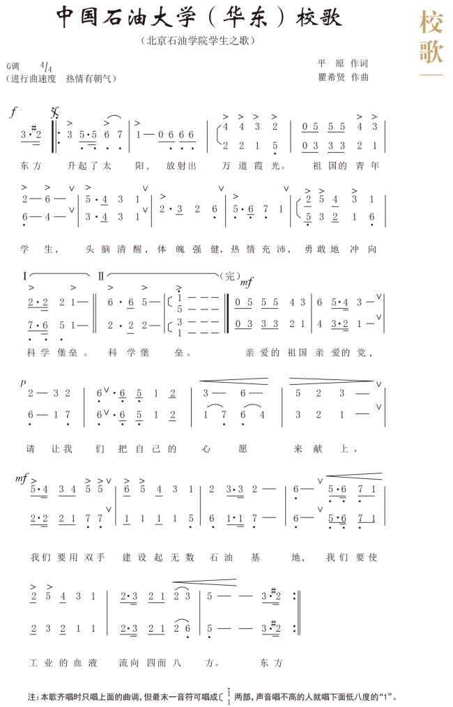 学校校歌为《北京石油学院学生之歌》,创作于1956年,北京石油学院海燕诗社学生集体(署名“平原”)作词,瞿希贤作曲。